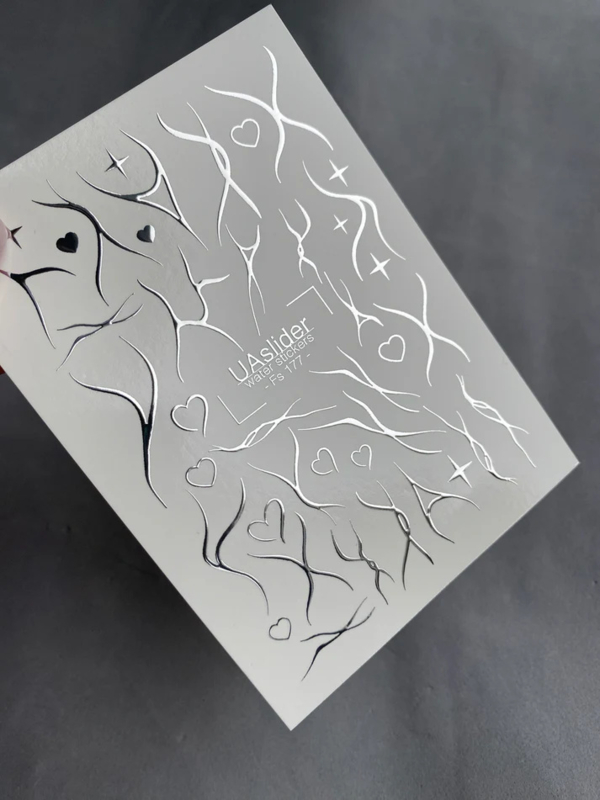Laat je creativiteit stromen met de UAslider FS 177 – Silver Flow Waterdecal Nail Stickers Line Art & Hearts.