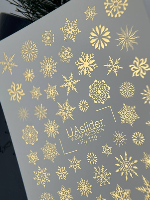 Geef jouw wintermanicure een luxueuze sparkle met de UAslider Fg 119 – Luxe Gold Snowflakes Waterdecals.