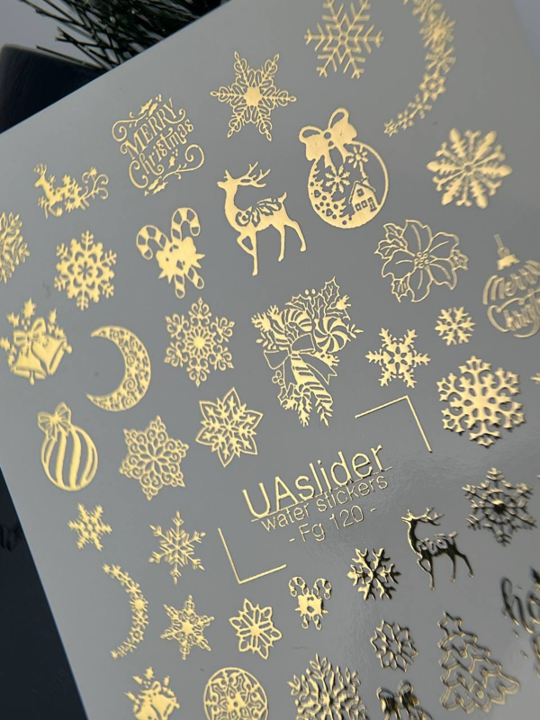 De UAslider Fg 120 – Luxe Gold Christmas Waterdecals laten jouw nagels schitteren met luxe kerstdetails en een elegante gouden glans. Perfect voor feestelijke manicures tijdens de decembermaand.
